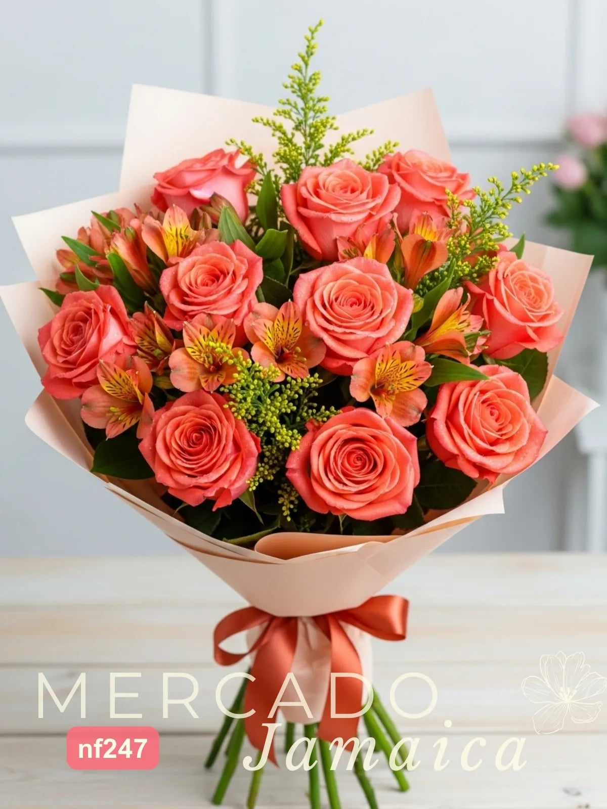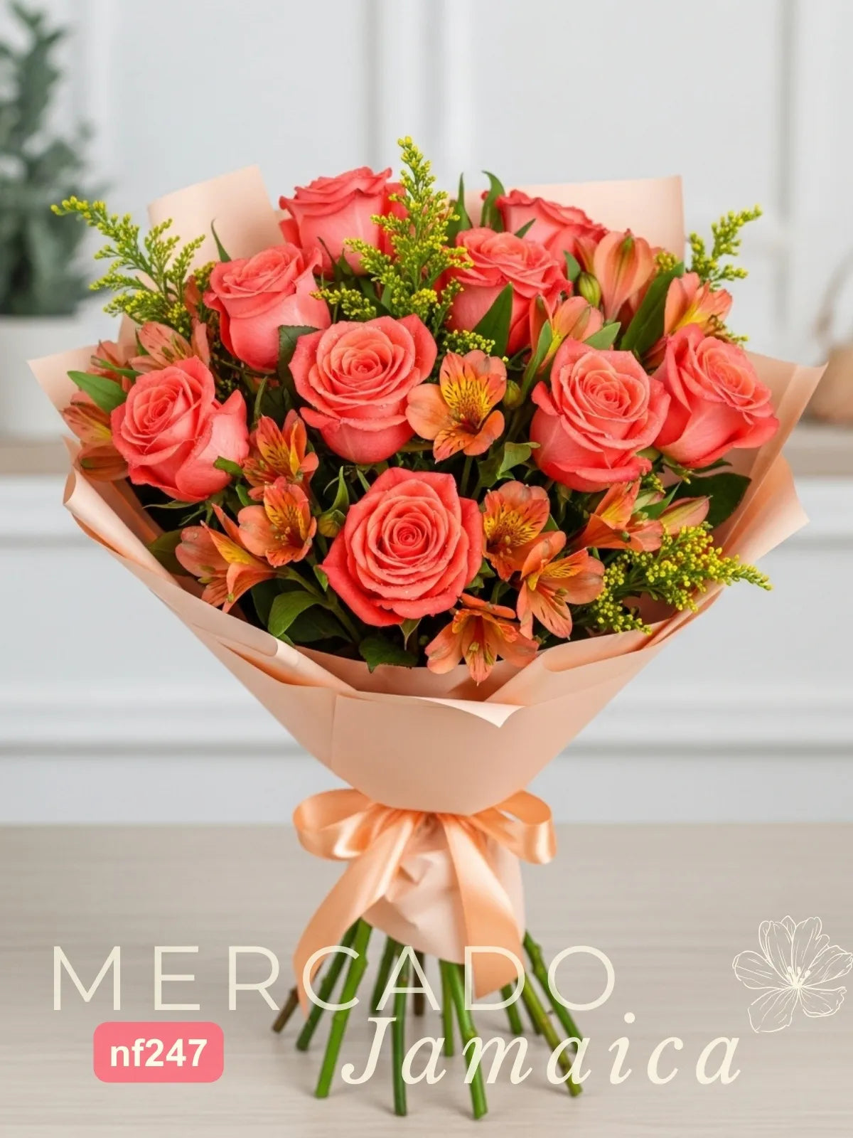 El ramo se presenta envuelto en delicados pliegos de papel de seda, en un color que complementa la paleta cálida y permite que la intensidad del naranja sea la protagonista. Un lazo une el conjunto con un toque final de elegancia.