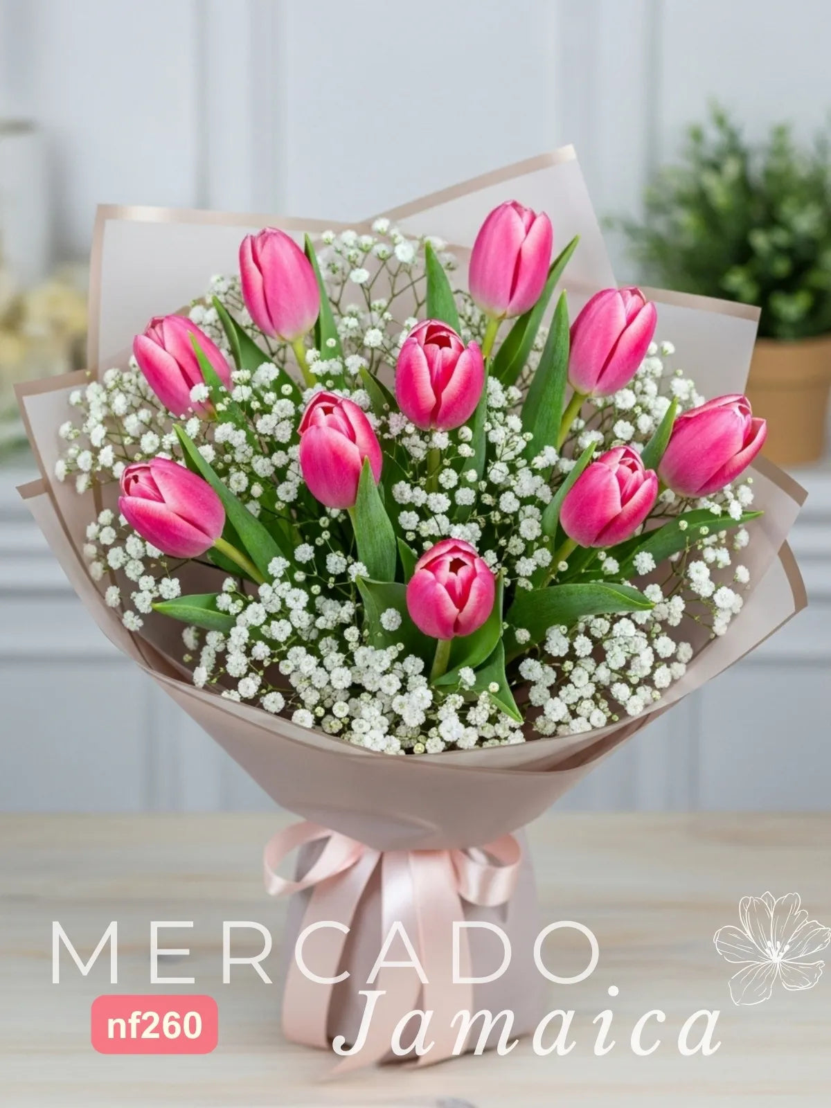 Descubre la magia de un ramo que redefine la elegancia del tulipán. Esta no es la flor que conoces; es una explosión de textura y color que captura la opulencia de una peonía en la silueta de un tulipán, creando un gesto de romance inolvidable.