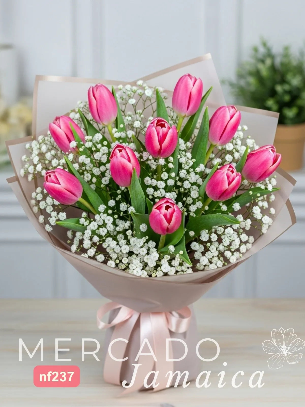 Para realzar su forma única, los tulipanes se rodean de una delicada y etérea nube de gypsophilia de la más alta calidad. Esta combinación suaviza el conjunto y añade una atmósfera de ensueño , creando un contraste perfecto entre la densidad de los tulipanes y la ligereza de la nube blanca, que parece flotar a su alrededor.