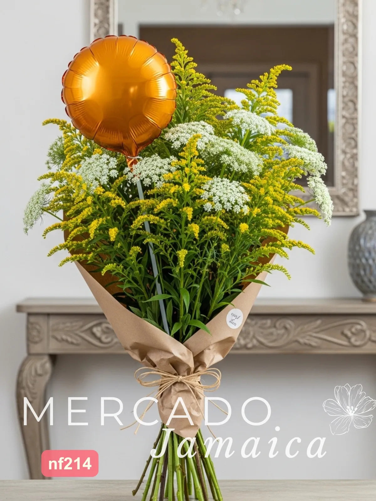 Un diseño que captura la luz y la delicadeza del campo. Este generoso ramo combina dos bounches completos de solidago, que aportan un vibrante color amarillo y una textura silvestre, con la suavidad del trachelium blanco, también conocido como "flor de encaje". Envuelto en papel kraft que realza su belleza natural y acompañado de un globo metálico, este arreglo es una celebración de la elegancia rústica y la alegría.