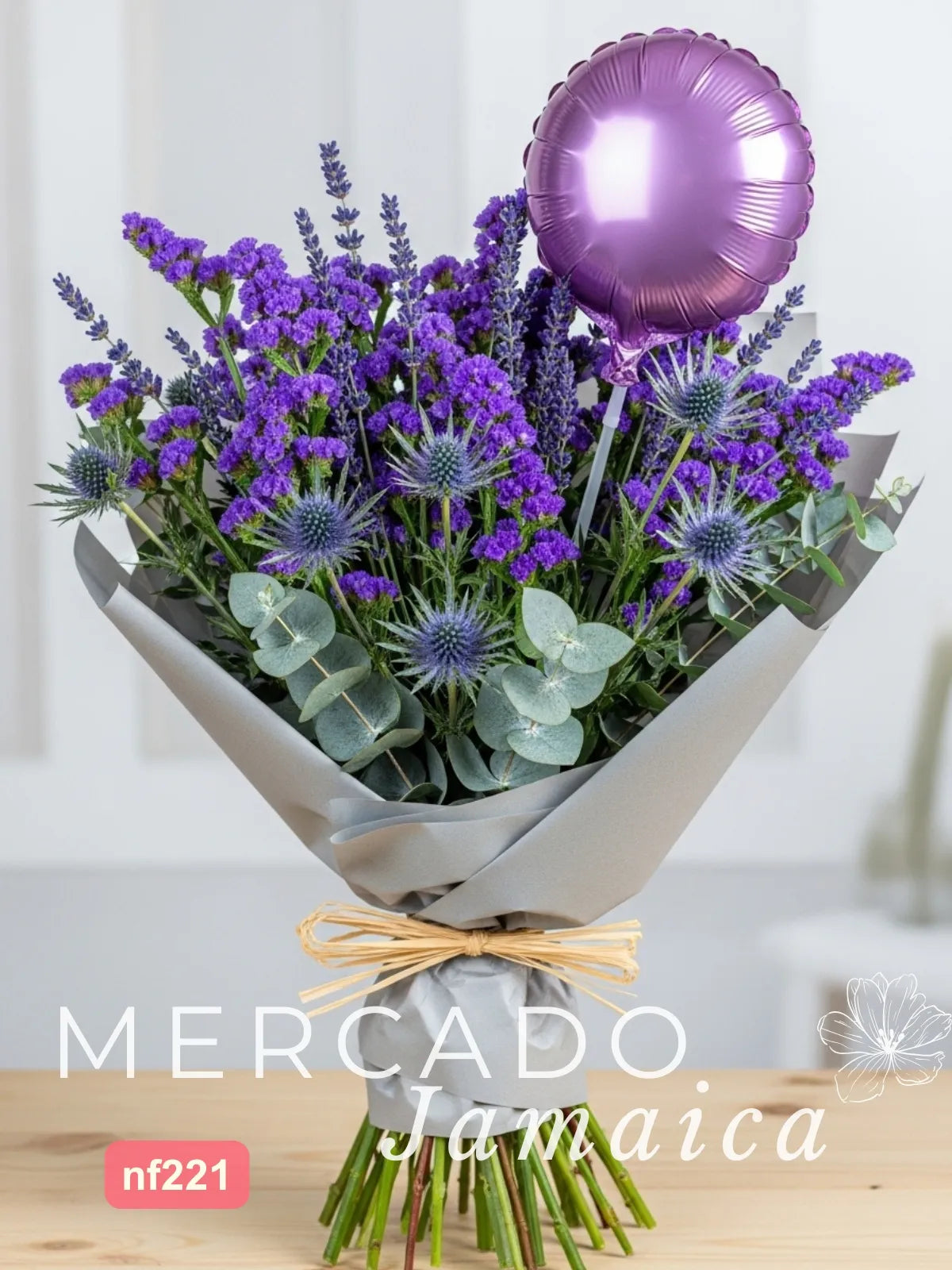 Un ramo diseñado para calmar los sentidos y deleitar con su sofisticación. La belleza única del eryngium azul se mezcla con los fragantes tallos de lavanda y la elegante caída del eucalipto dólar. Esta composición, rica en texturas y aromas, se presenta en una delicada envoltura de papel de seda y se acompaña de un globo metálico para una celebración serena y con mucho estilo.