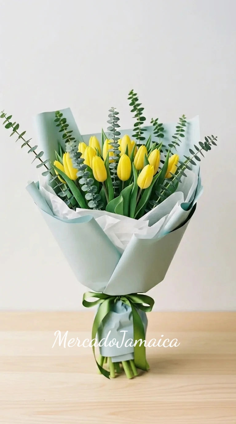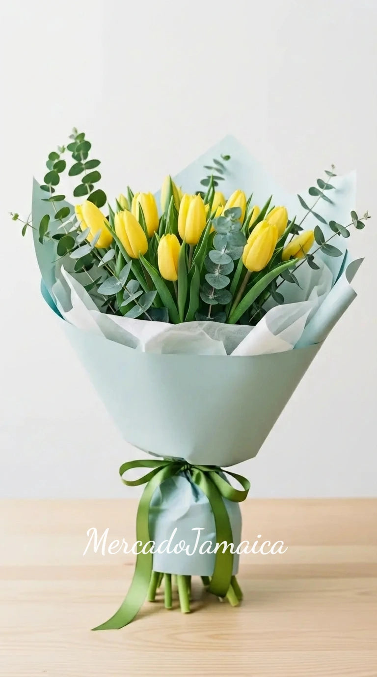 Radiantes y alegres, 20 tulipanes amarillos para iluminar el día. Envueltos en papel decorativo y un moño satinado.