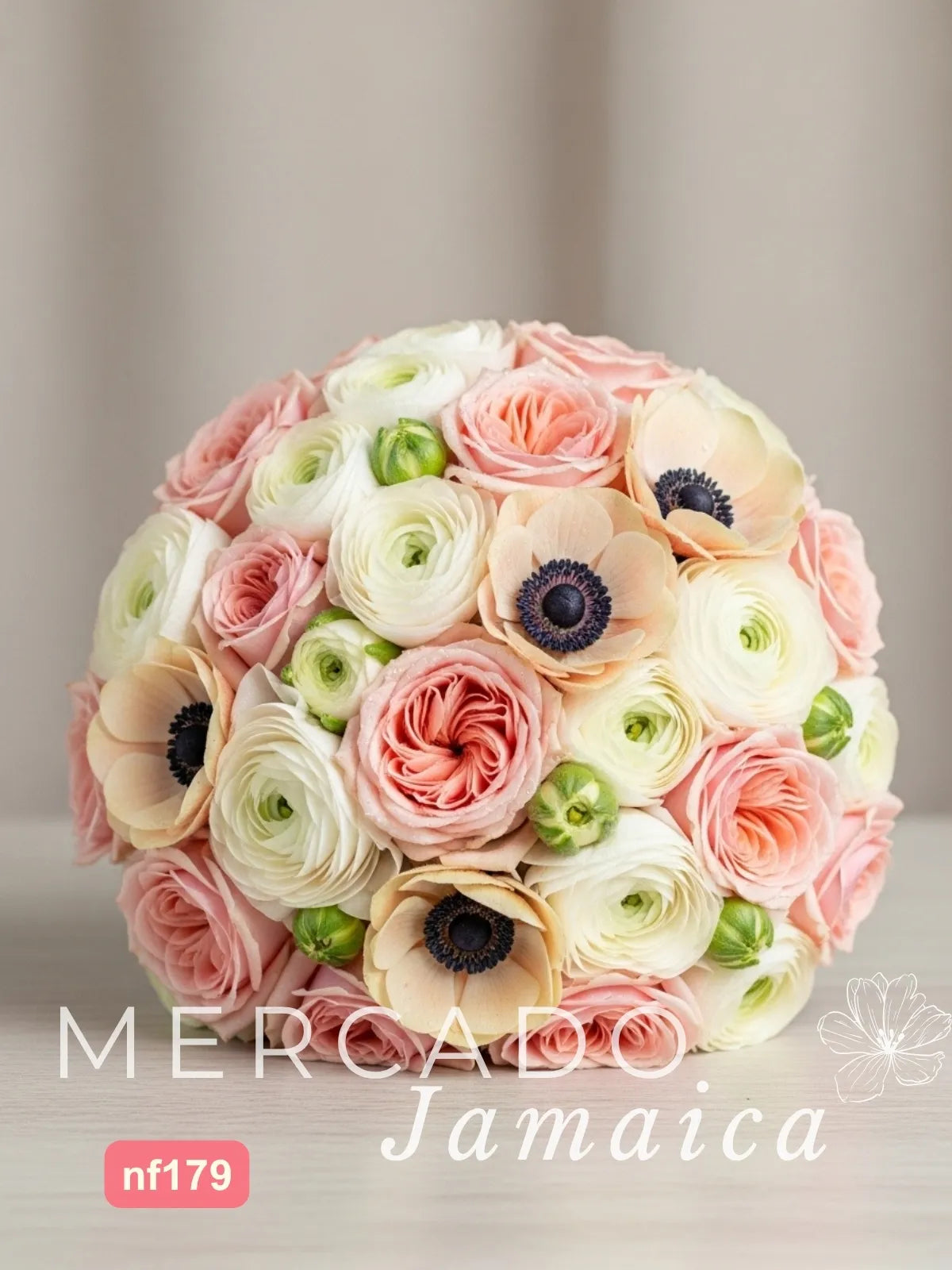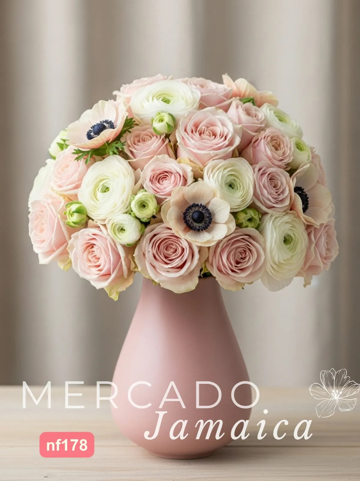 Un diseño que es pura delicadeza y romance moderno. 18 rosas, 10 ranúnculos blancos y 10 encantadoras anémonas crean una composición rica en texturas y detalles. Presentado en un florero de cerámica rosa mate, es un regalo que combina ternura con un toque chic y contemporáneo.