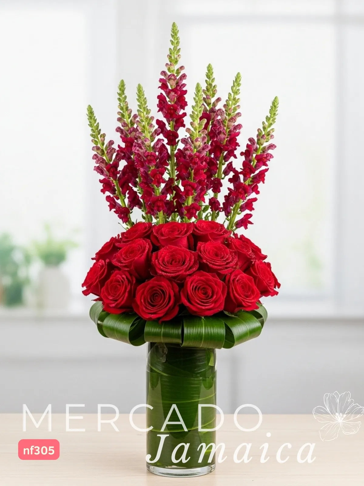Este arreglo floral es una audaz combinación de pasión y elegancia. Dieciocho rosas rojas, el símbolo universal del amor, se complementan con ocho perritos vino, que añaden un toque de dramatismo y textura. Presentado en un elegante florero de vidrio tipo cilindro y adornado con hojas de dracena, este diseño es ideal para expresar un sentimiento profundo con un estilo contemporáneo.