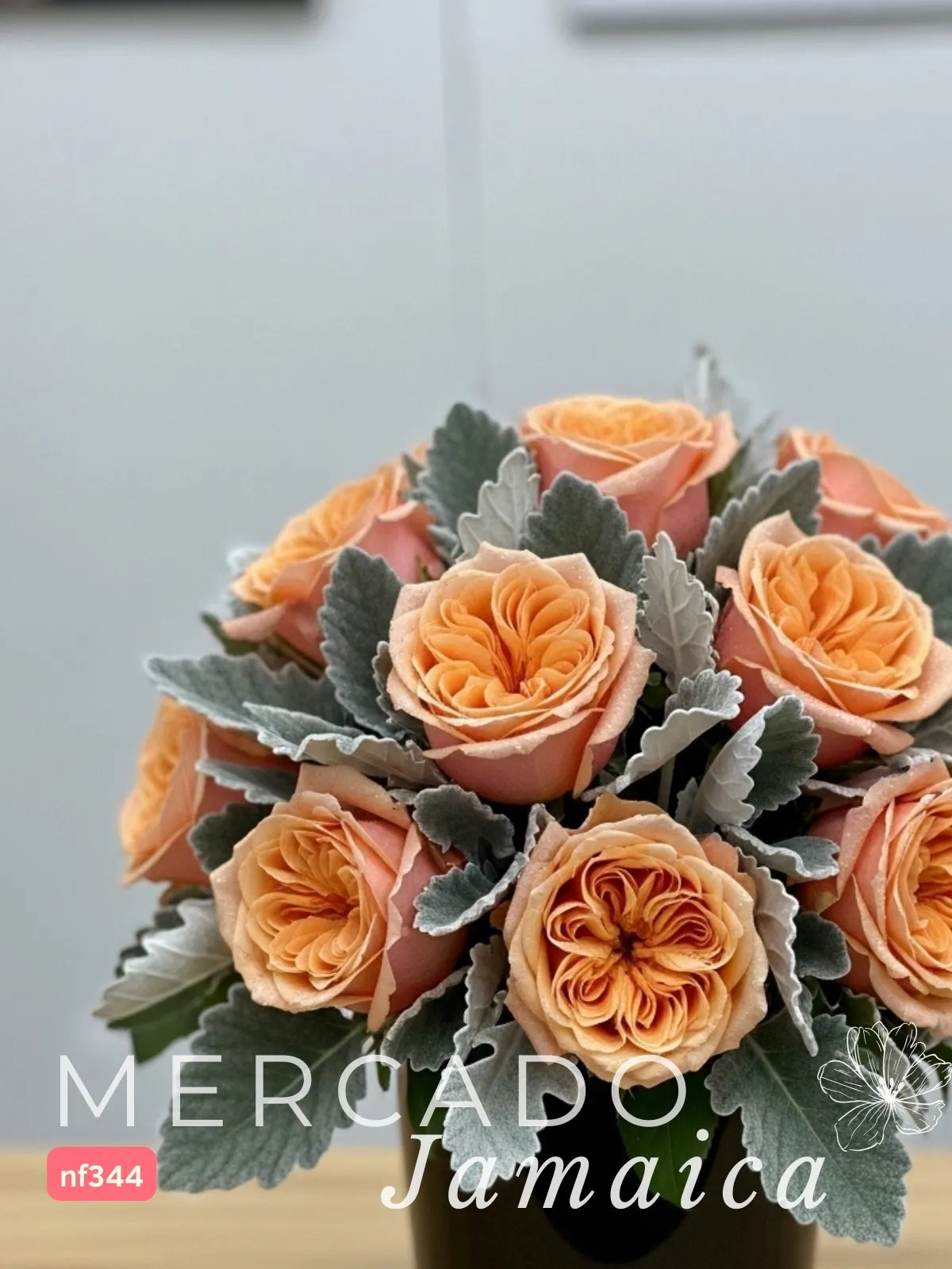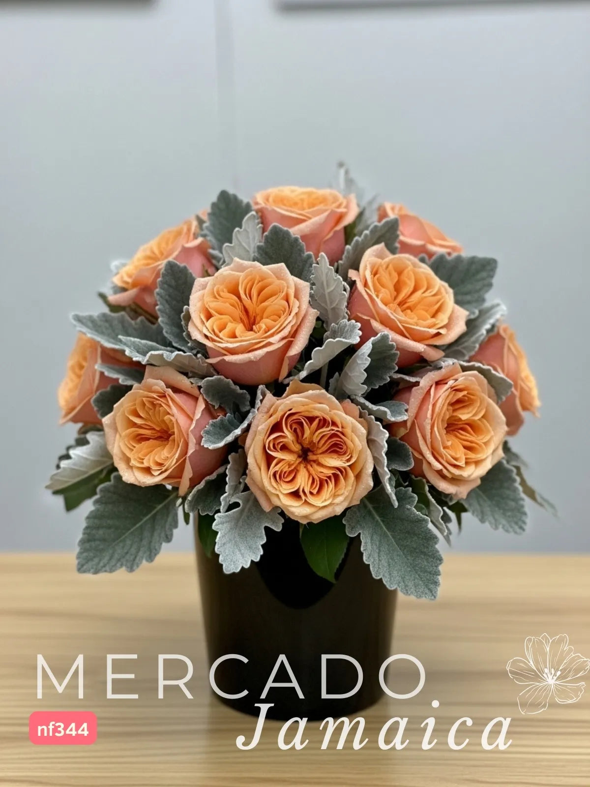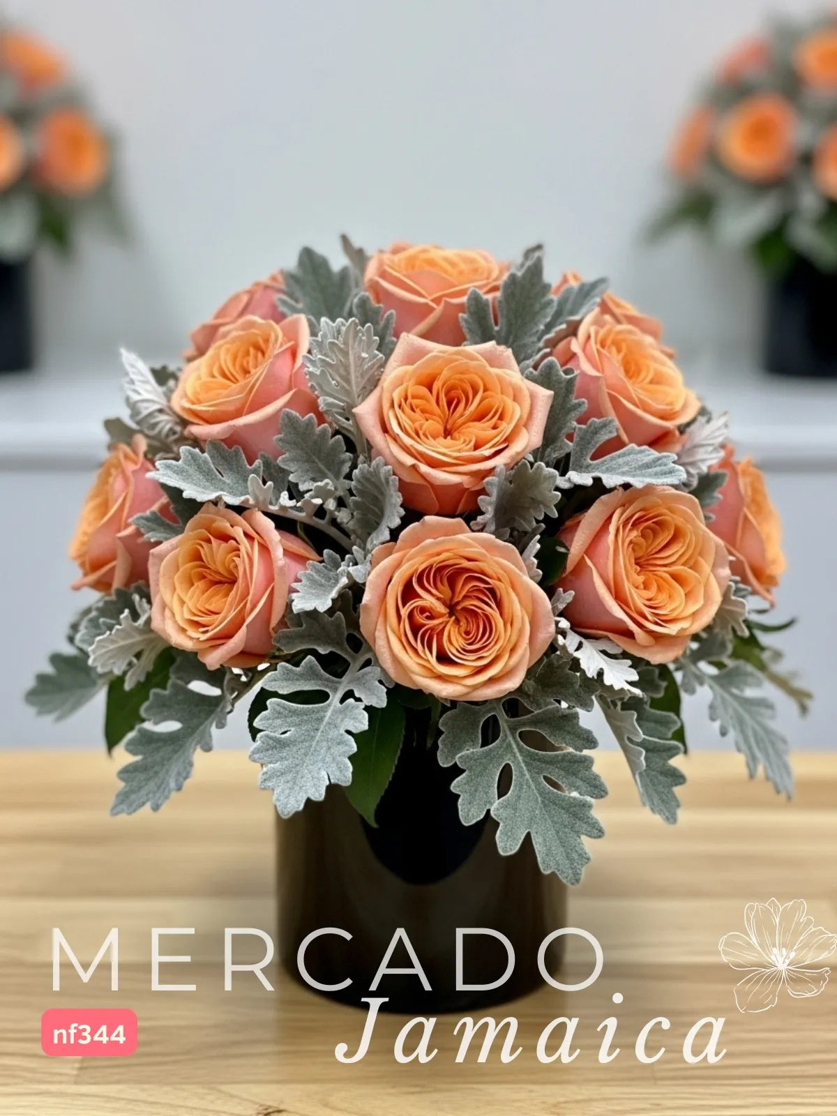 Un arreglo floral que evoca alegría y vitalidad con la vibrante belleza de diez rosas Mandarin X-pression, también conocidas como Locura. El follaje de dusty miller añade un toque aterciopelado y suave, creando un contraste delicado y armonioso. Presentado en un florero de cerámica tipo cilindro con espuma floral, es el regalo perfecto para celebrar cualquier ocasión especial con un estilo alegre y refinado.