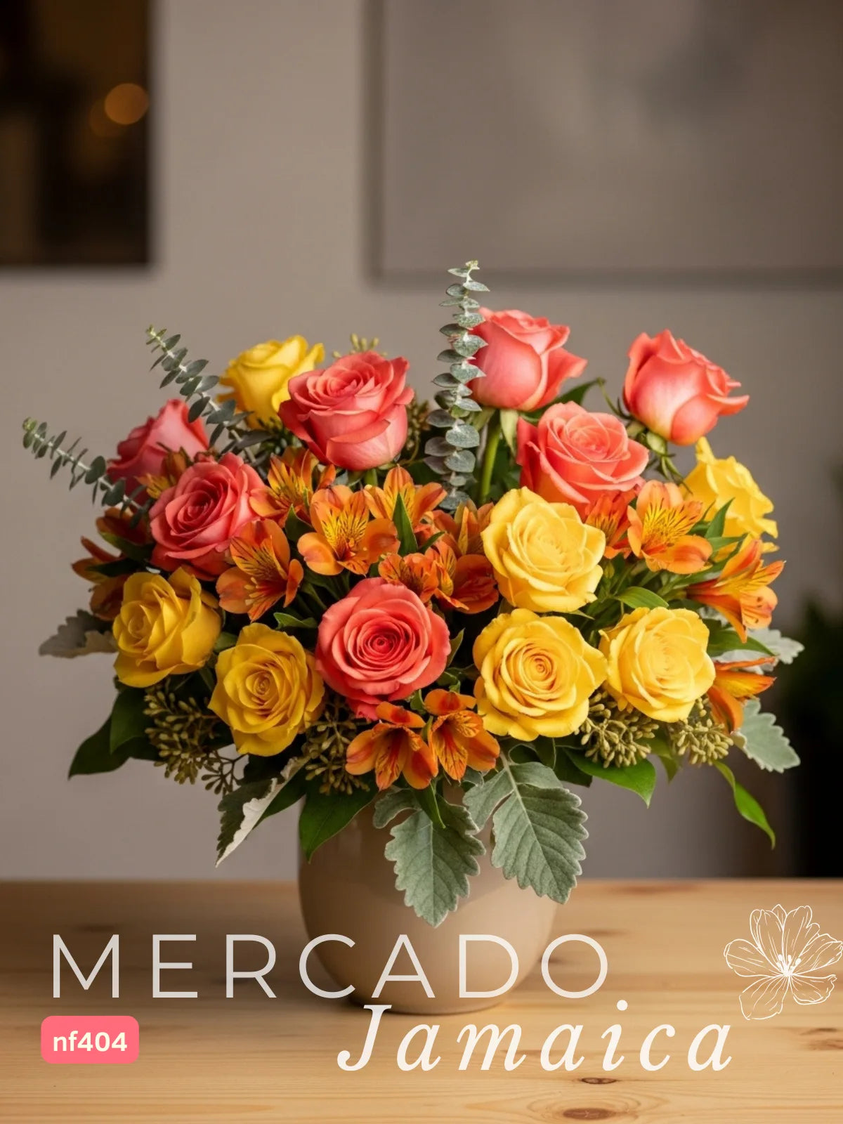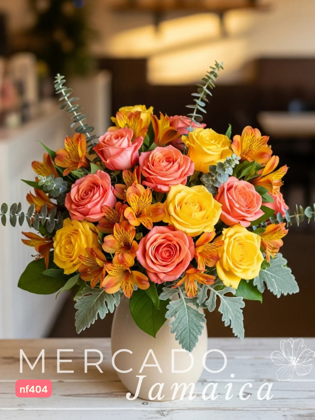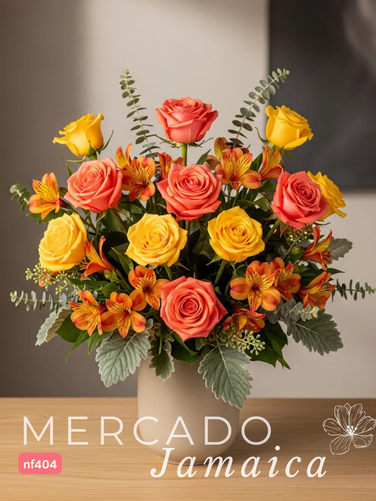 Un arreglo floral vibrante que evoca la alegría y el entusiasmo con una combinación de flores en tonalidades cálidas. Doce rosas naranja simbolizan el encanto y el deseo, mientras que doce rosas amarillas añaden un toque de amistad y felicidad. El diseño se complementa con alstroemerias, follaje de dusty miller y tallos de dólar, que aportan un toque de frescura y originalidad. Todo el conjunto se presenta en un florero de cerámica, ideal para un regalo inolvidable.