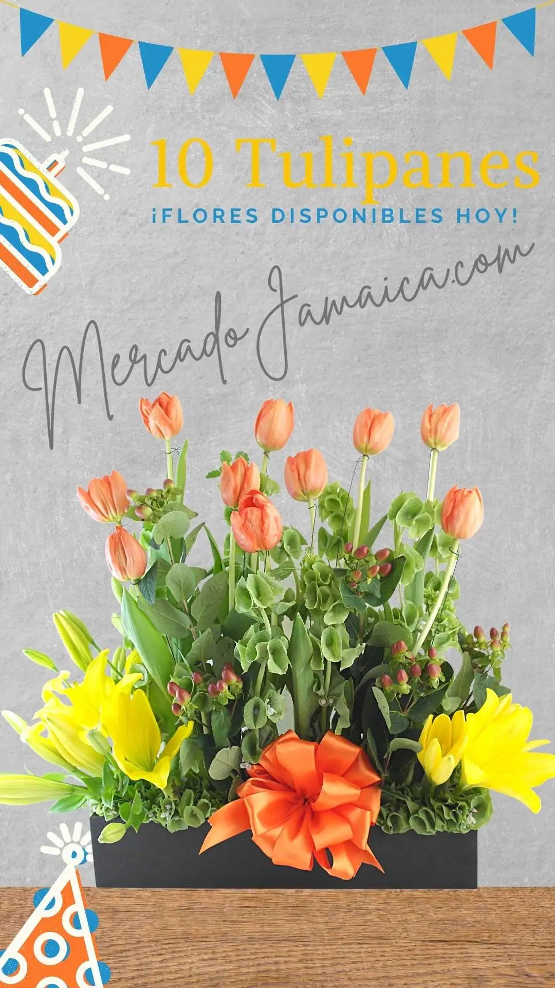 Este hermoso arreglo floral combina la vivacidad de los Tulipanes Naranja con la delicadeza de las Flores Lilies Amarillas. Es la elección perfecta para iluminar tus momentos especiales.