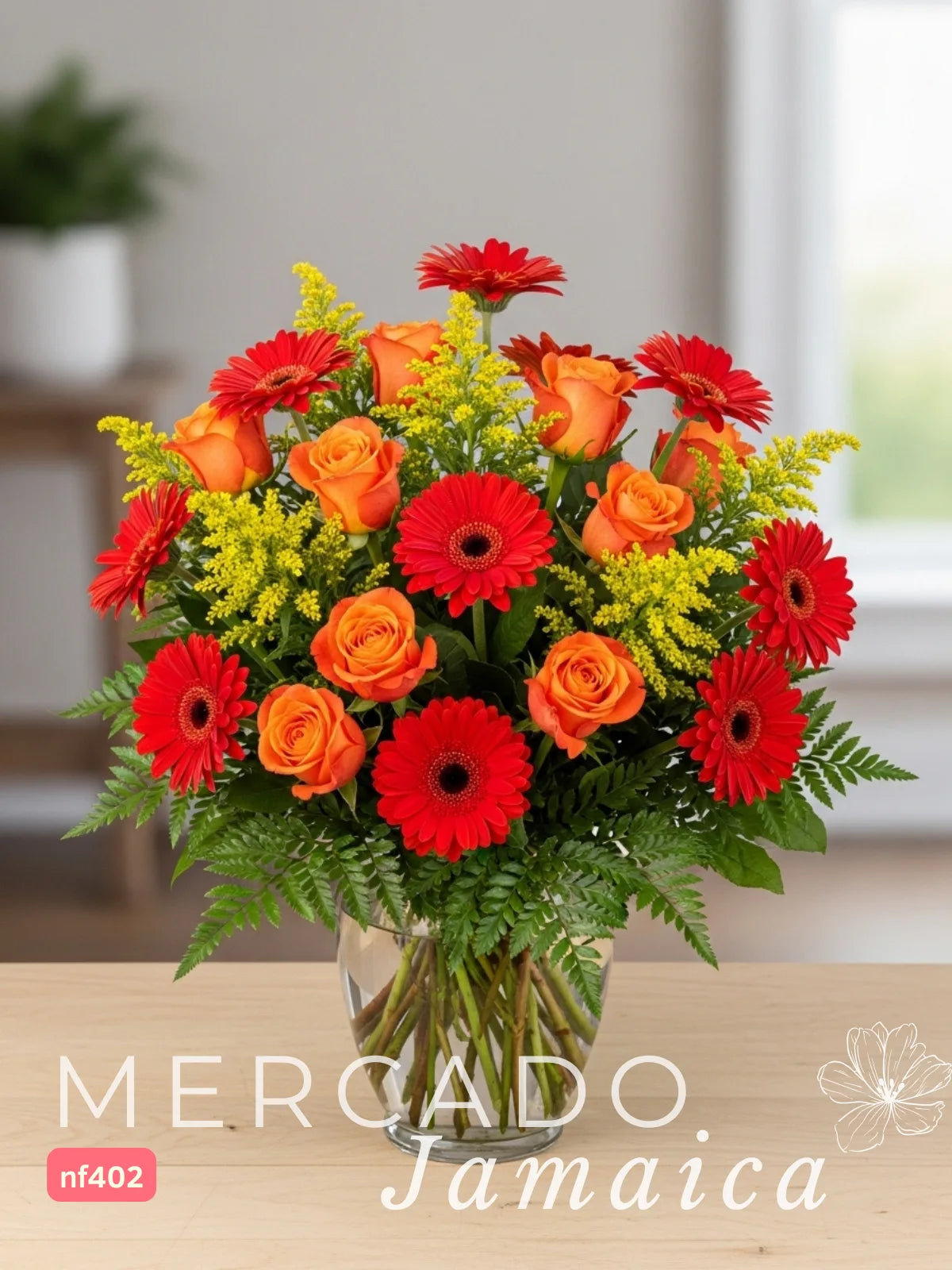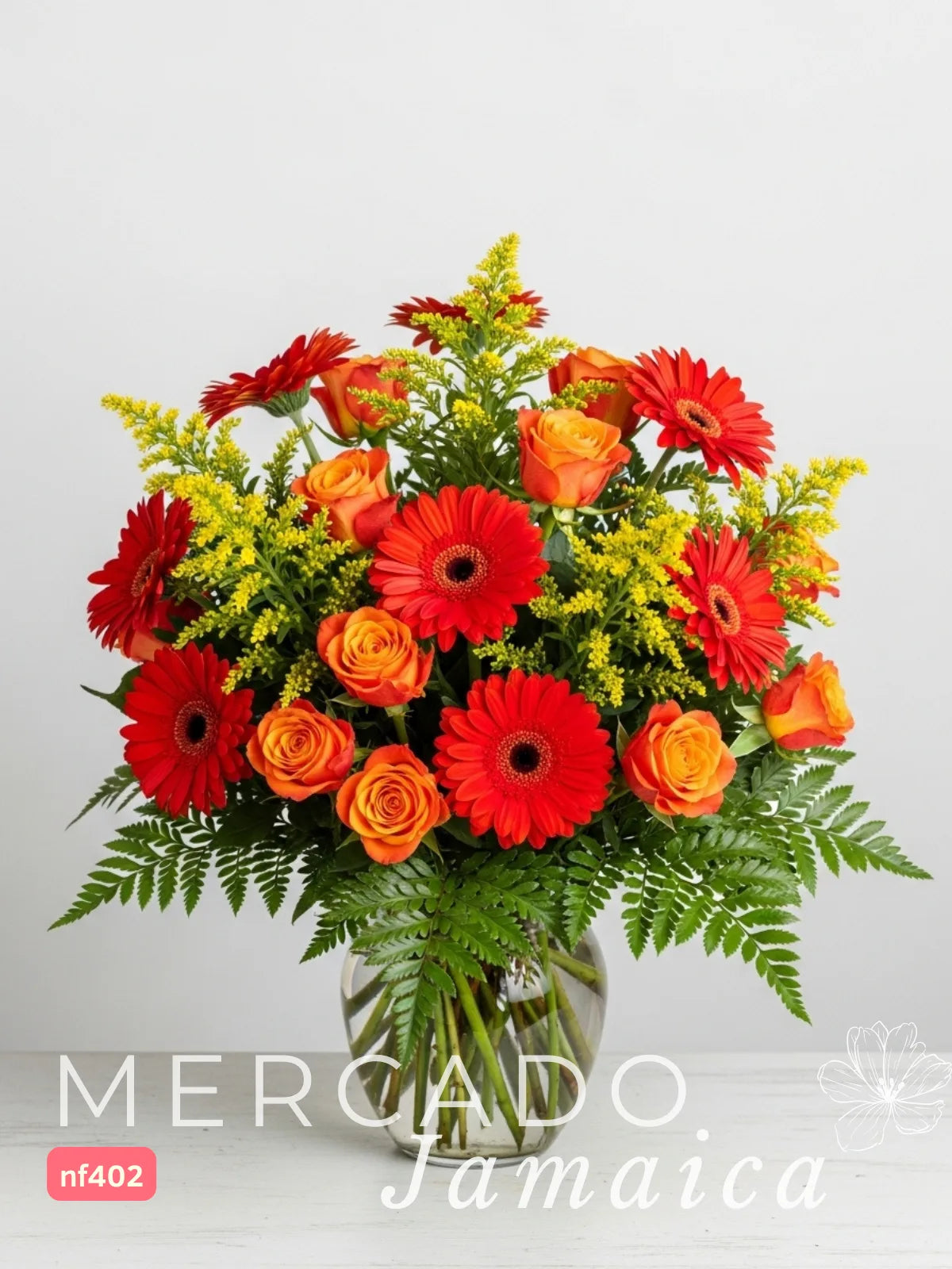 Un arreglo floral vibrante que captura la alegría y el entusiasmo con una combinación de flores en tonalidades cálidas. Diez gerberas naranja simbolizan la energía y el entusiasmo, mientras que dieciocho rosas naranja añaden un toque de encanto y sofisticación. El diseño se complementa con follaje solidago y follaje leather que aportan un toque de frescura y originalidad. Todo el conjunto se presenta en un florero de vidrio tipo jarrón, ideal para un regalo inolvidable.